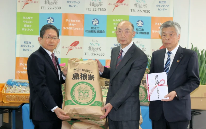 このたび、支援活動の一環として、松江市社会福祉協議会が実施する「ひとり一品運動(市民や企業から寄付された食料品を、支援を必要とする世帯に配布する活動)」に協力し、2025年12月22日(月)に米、レトルト食品、カップ麺、缶詰などの食料品を寄贈いたしました。