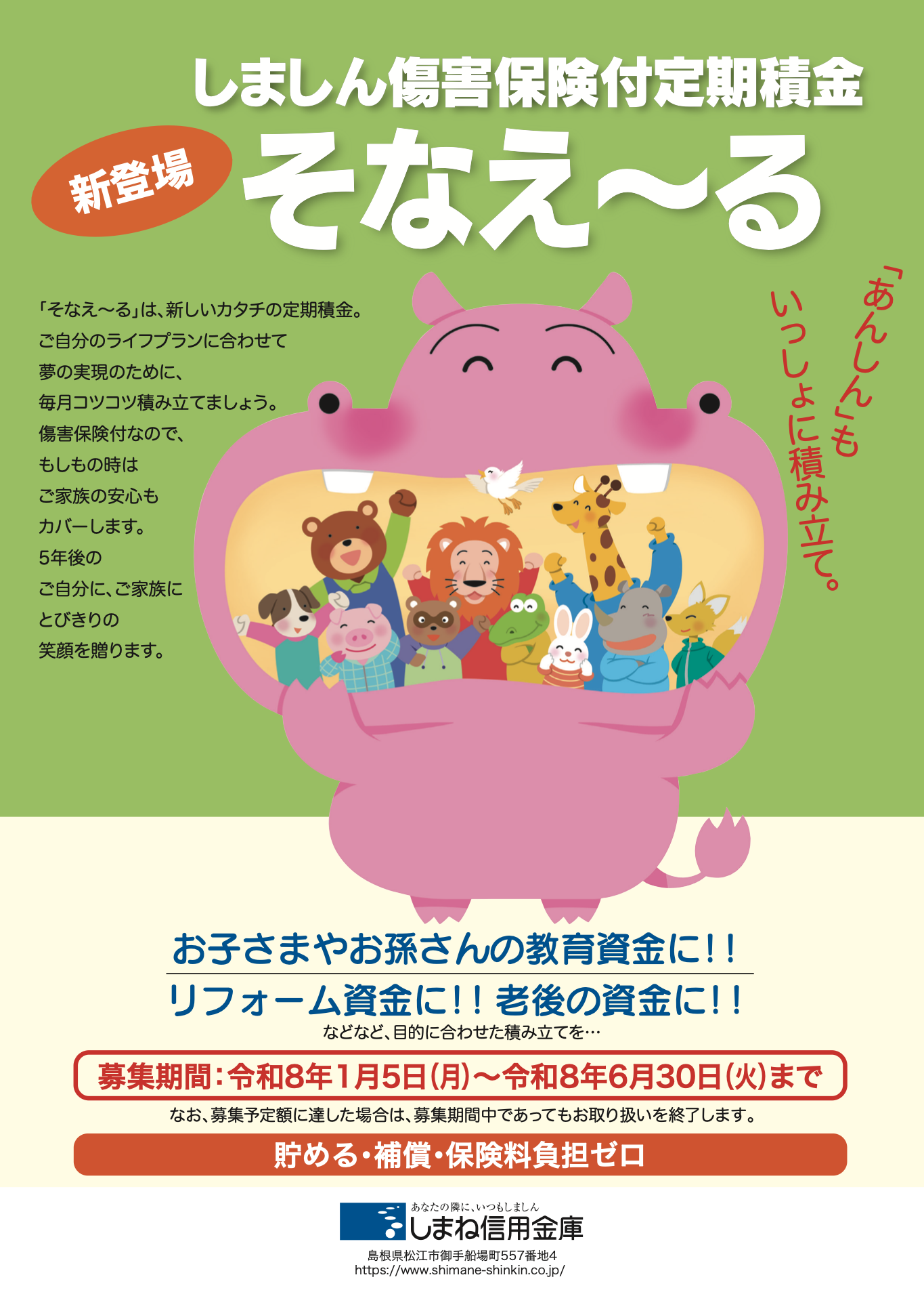 しまね信用金庫(理事長 藤原 俊樹)は、2026年1月5日(月)より、しましん傷害保険付定期積金「そなえ~る」を発売しますので、お知らせします。