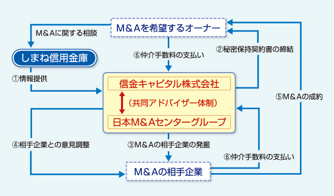 しまね信用金庫では、地元中小企業の事業継承・営業権譲渡・企業買収などのニーズにお応えするため、信金キャピタル株式会社(信用金庫のセントラルバンクである信金中央金庫の100%子会社)および株式会社日本M&Aセンター(東証一部上場企業)と提携し、M&A仲介業務を行っております。