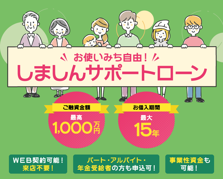 | ご利用いただける方 | ・年齢が満20歳以上、且つ完済時満86歳未満の個人(個人事業主・会社経営者含む)の方 ・安定継続した収入のある方 〈個人の場合〉 パート・アルバイト・年金受給者も可。専業主婦でも世帯収入があれば可。 〈個人事業主・会社経営者の場合〉 事業の営業年数に制限なし ・電話連絡の可能な方 ・保証会社(株式会社クレディセゾン)の保証を得られる方 |